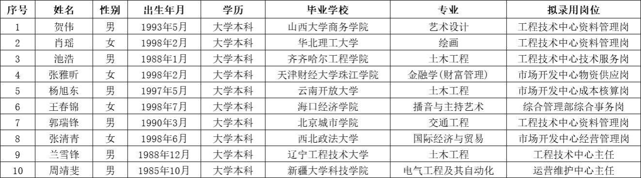 所属公司山西必通安装工程有限公司2022年公开社会招聘公告》,山西必通安装工程有限公司组织实施了公开招聘工作,经网上报名、笔试、面试、资格审查、体检等程序,拟录用10人,现将录用结果予以公示: