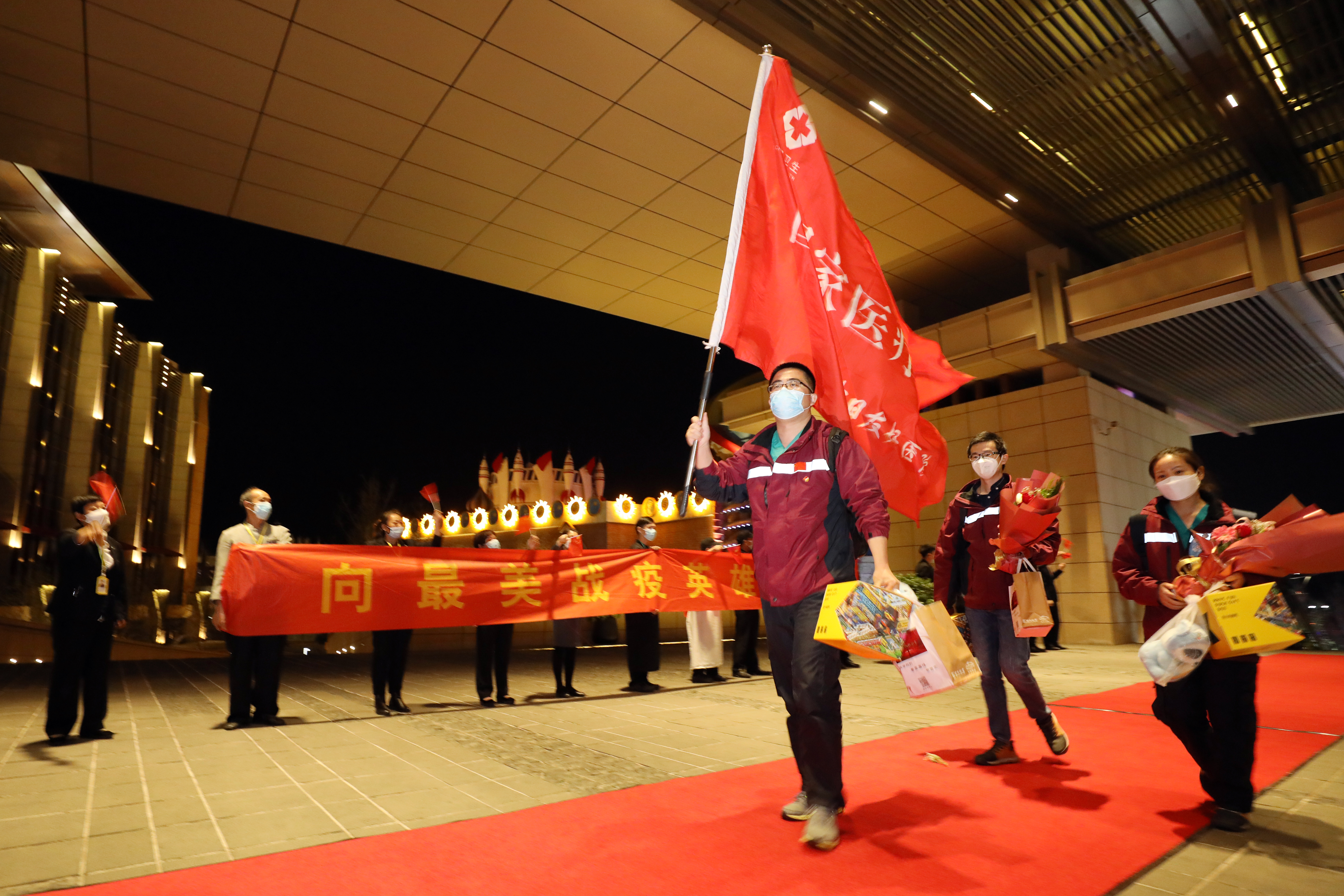 在十五满月的照耀和各类绚烂彩灯的映衬下,乐多港迎宾大道显得格外庄严和热闹。由大小500多面鲜艳的五星红旗组成的国旗通道、360多名各界干部群众、奇幻乐园国际大马戏迎宾马队、小龙人和演员方阵都翘首以盼,热切等待着那激动人心的一刻。21时26分,国家援鄂医疗队157名医护人员和专家全部顺利入住乐多港万豪酒店,回到了他(她)们回京后的第一个“家”。